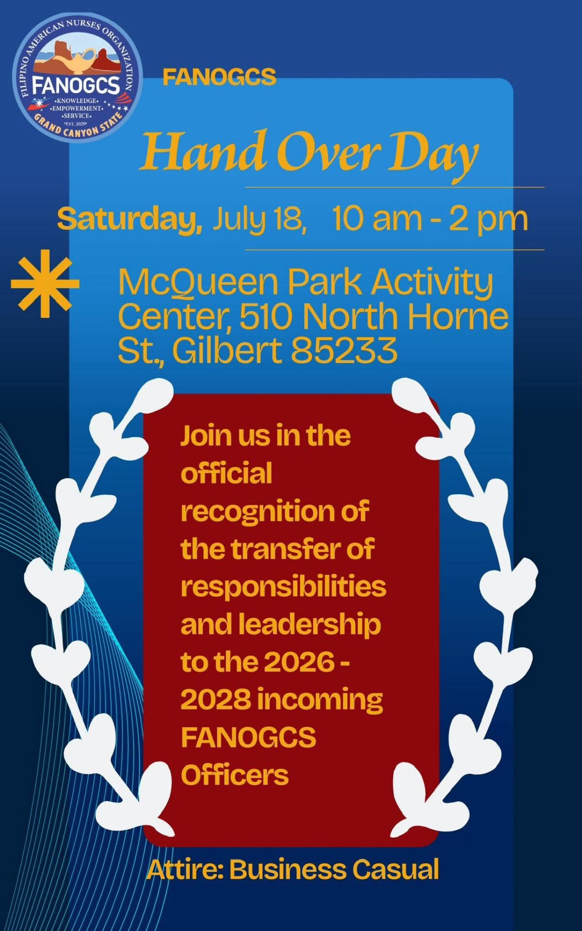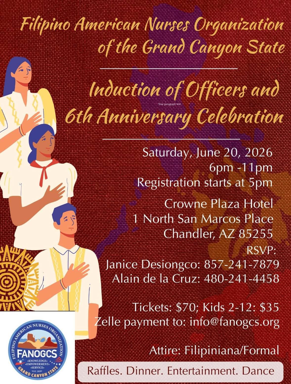 One of the biggest events of the Filipino American Nurses Organization of Grand Canyon State is happening on June 21st, 2025. Hollywood Glamour is a red carpet event that celebrates the 5th Anniversary of FANOGCS. It is a fundraiser dinner to benefit FANOGCS’ mission to serve the community. You have an opportunity for sponsorship, souvenir ads, vendor table and donation. There will be dinner, entertainment, raffles and DJ music. Attire is Creative Formal. Dress to impress, dress as a Hollywood celebrity. Reserve your tickets now. Please contact Alain De La Cruz, Melody Orillo, Amy Laxamana, Faith Melody Maglinte or any of the officers for inquiries and tickets.